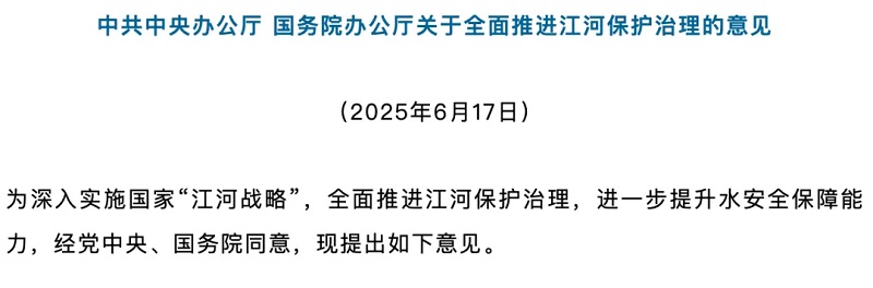 首次明確將流域綜合治理 提升至國家戰(zhàn)略高度 2025年6月17日,《中共中央辦公廳國務(wù)院辦公廳關(guān)于全面推進(jìn)江河保護(hù)治理的意見》(以下簡稱《意見》)正式發(fā)布。