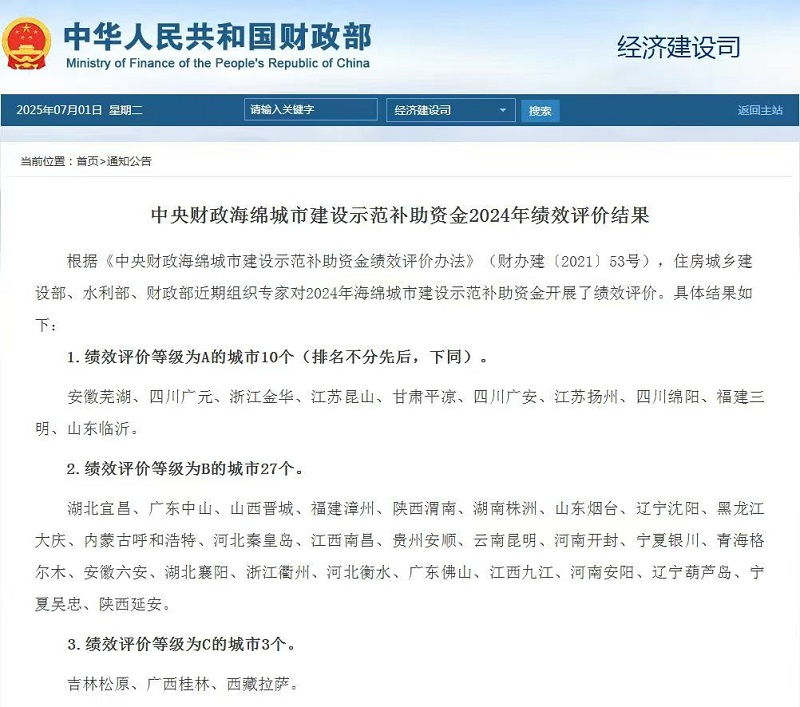 根據(jù)《中央財(cái)政海綿城市建設(shè)示范補(bǔ)助資金績效評(píng)價(jià)辦法》,住房城鄉(xiāng)建設(shè)部、水利部、財(cái)政部近期組織專家對(duì)2024年海綿城市建設(shè)示范補(bǔ)助資金開展了績效評(píng)價(jià)。具體結(jié)果如下: