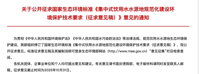 為貫徹《中華人民共和國(guó)環(huán)境保護(hù)法》《中華人民共和國(guó)水污染防治法》,規(guī)范飲用水水源地生態(tài)環(huán)境保護(hù)建設(shè),提升水源水質(zhì)安全保障水平,生態(tài)環(huán)境部日前發(fā)布通知,就《集中式飲用水水源地規(guī)范化建設(shè)環(huán)境保護(hù)技術(shù)要求(征求意見稿)》(以下簡(jiǎn)稱《征求意見稿》)公開征求社會(huì)各界意見,意見反饋截止日期為2025年10月31日。